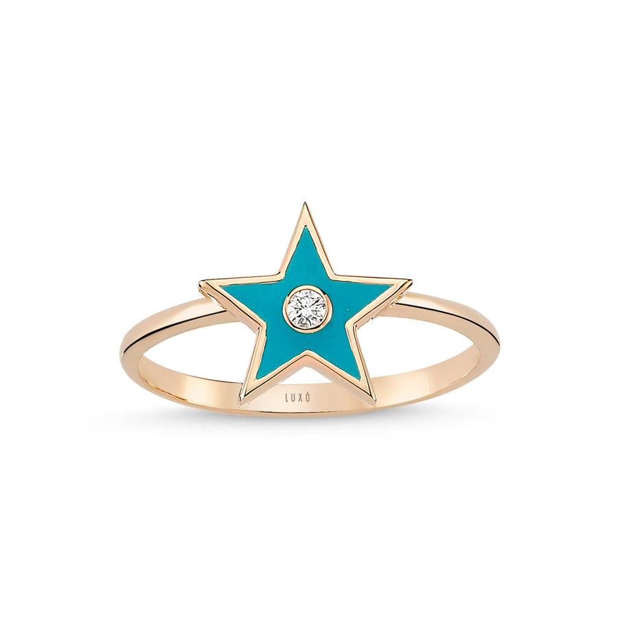 Embrace celestial elegance with our 14-carat rose gold star ring! This stunning piece features a brilliant round-cut diamond nestled at the heart of a star-shaped design, embraced by vibrant blue enamel.